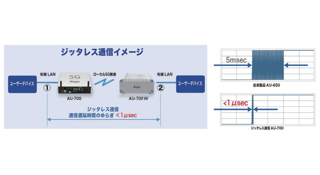 従来の無線通信システムでは実現ができなかったジッタレス通信をローカル5Gで実現しました。工場から複雑な配線をなくし、レイアウト変更が自由な生産ラインを可能とする次世代スマート工場の実現に貢献します。