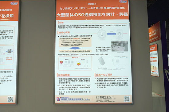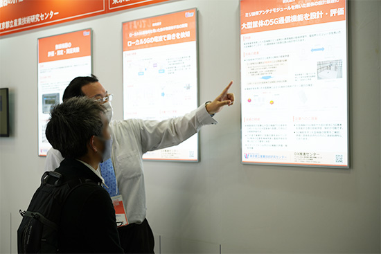 都産技研ブースでは、研究員による新たな5G研究テーマと5G分野の公募型共同研究の成果、高周波分野の共同研究成果及びローカル5G研究会の活動や高周波分野のパネルとデモ展示を行いました。
